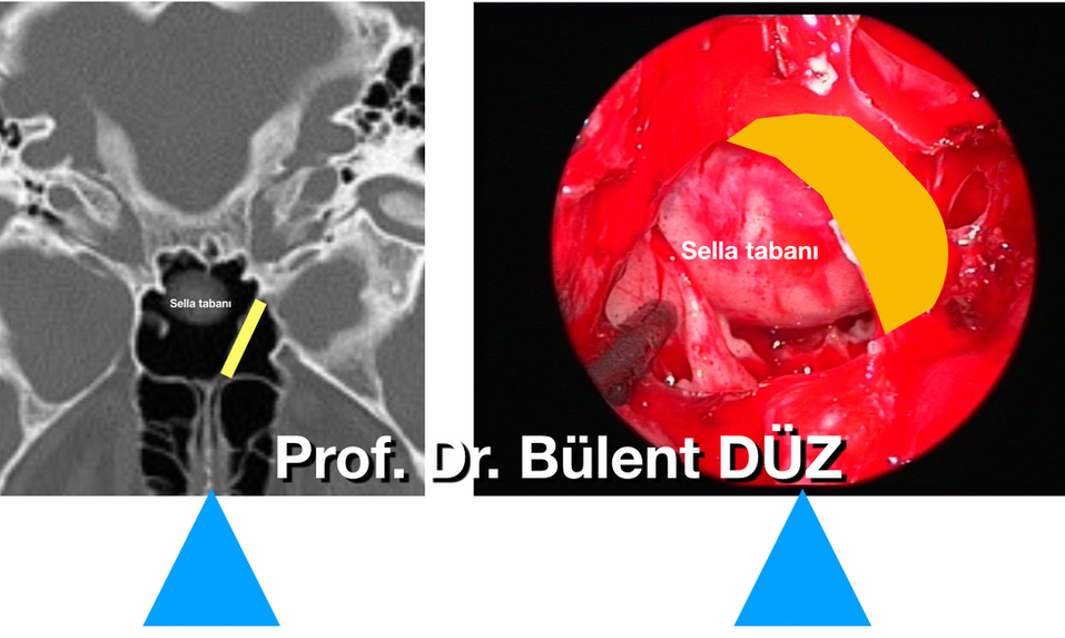 Informing patients in detail about the surgical technique to be applied makes it easier to reduce postoperative pain and other problems. It should also be noted that this is a legal obligation. All patients scheduled for endoscopic endonasal pituitary surgery must undergo a detailed nasal and sinus examination. Complaints such as headache, feeling of pressure on the face, smell problems, postnasal drip, which are symptoms of sinus infection, and previous surgeries and traumas should be questioned. An endoscopic examination of the nasal passages should be performed to investigate whether there are any problems that may affect the surgery, such as infection, nasal flesh growths, nasal deviations, or polyps. In patients with infection or polyps, these problems must be treated medically or surgically before surgery. In this type of surgery, septal or other nasal anatomical variations may sometimes make endoscopic intervention difficult. (Picture 4). In this case, the wide opposite nasal passage can be used, or turbinate resection or nasal septum surgery can be added to the operation. Additionally, serious intranasal curvatures can be corrected during pituitary surgery. Paranasal sinus computed tomography (CT) should be taken for each patient to know the structure of the nasal passage and sphenoid sinus. In these images, the turbinates, the structure of the sphenoid sinus, the sphenoid sinus aeration, the localization of the intra-sphenoid sinus septa and their relationship with the sella floor should be carefully studied in the preoperative period. (Figure 5 a,b) If possible, the sphenoid sinus ostium is determined. It should be kept in mind that the sphenoid sinus ostium is located in the upper part of the anterior sinus wall with a probability of 52-89.5% (60). This is very important to prevent complications that may develop perioperatively. It should be noted that sometimes the sphenoid sinus septa may be adherent to the carotid bulge. Before surgery, all patients should undergo a complete physical examination, neurological examination, endocrinological evaluation of hormone levels and visual field examination, as well as computerized sinus tomography in a format suitable for navigation and magnetic resonance (MR) examinations for pituitary pathology.