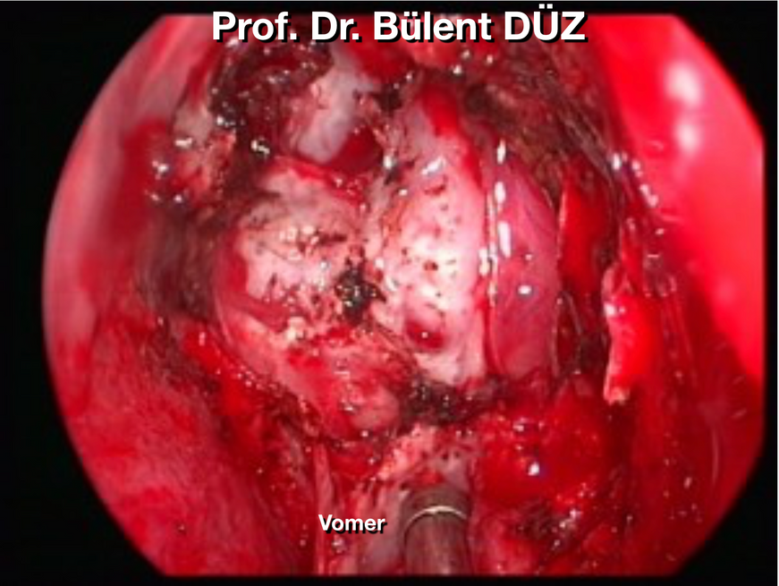 Resim 23/3:Bu ameliyatta kapatmada orta konkanın devrilmesinden sonra sfenoid sinüs içi, devrilmiş orta konka ve koana gösterilmiştir.